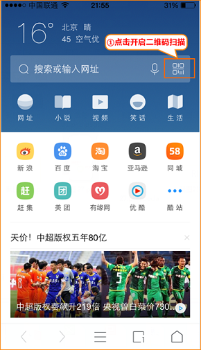 (1)、打开手机浏览器(此处以UC浏览器为参考),点击浏览器自带扫描二维码功能。