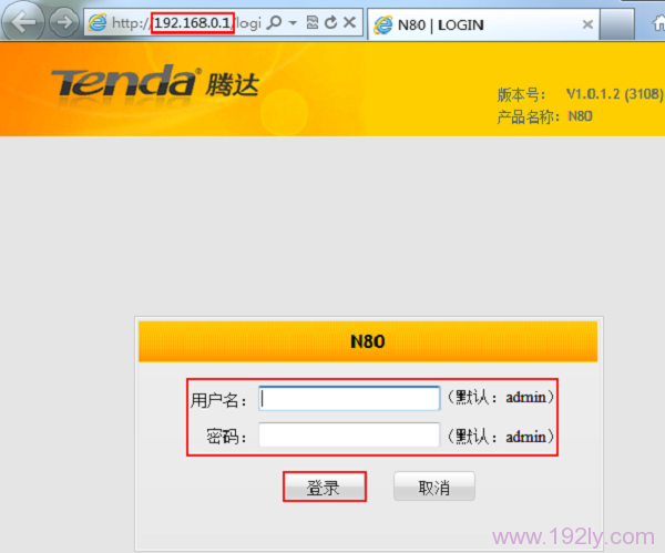 1、登录设置界面:在浏览器输入192.168.0.1 回车,在弹出的页面中输入用户名:admin 密码:admin,然后点击“确定”。(如果输入192.168.0.1后打不开,请点击阅读文章:腾达(Tenda)无线路由器192.168.0.1 打不开)