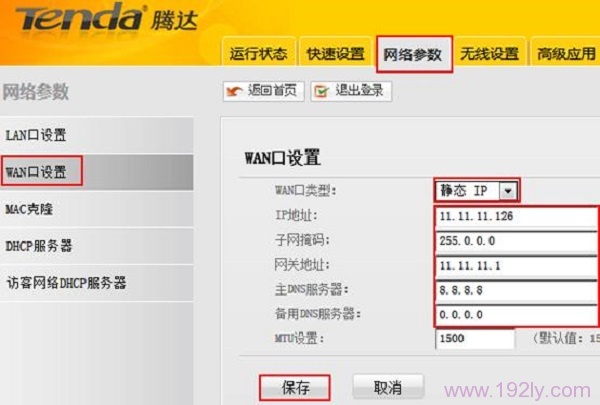 则在设置腾达N80路由器上网的时候,就应该选择:静态IP。详细设置是,在N80的设置界面,点击“高级设置”选项,进入到N80路由器的高级设置界面。然后点击“网络参数”——>“WAN口设置”——>“WAN口类型”选择:静态IP——>填写IP地址、子网掩码、网关、DNS——>点击“保存”。