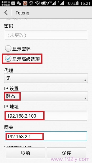 2、在跳转的页面中选择“高级设置”——>“IP设置”选择:静态IP——>“IP地址”设置为:192.168.2.100——>“网关”设置为:192.168.2.1——>点击“保存”。