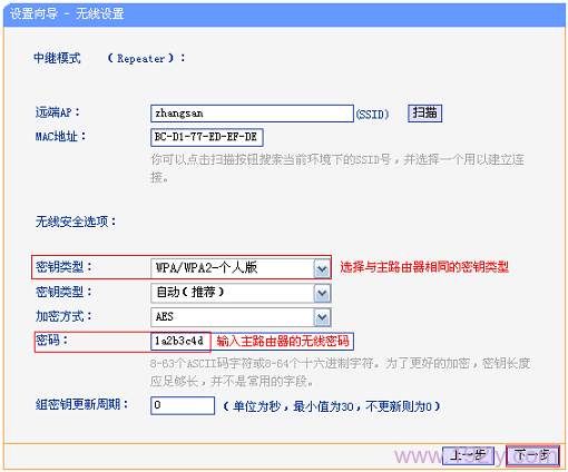 “密钥类型”选择:WPA/WPA2-个人版(与被放大的无线信号的密钥类型相同)——>“密码”位置中输入:被放大的路由器的无线密码——>点击“下一步”。