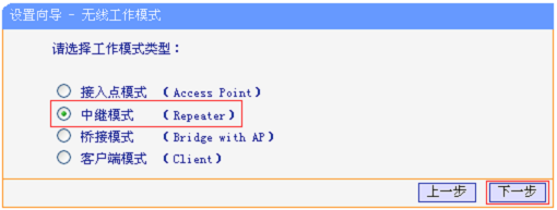 3、选择无线工作模式:选择“中继模式(Repeater)”——>点击“下一步”。