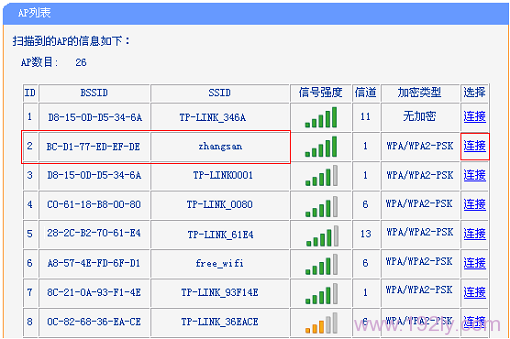 4、在扫描的结果页面中,找到需要被中继的无线信号名称(本例是:zhangsan),然后点击“连接”