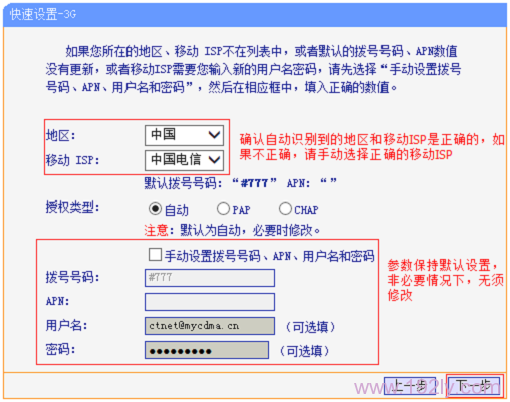 确认路由器识别到正确的ISP(3G运营商)后,点击“下一步”。具体的请参见下面的图片信息