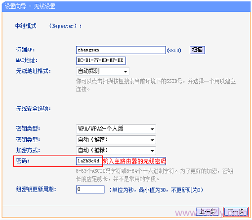 请在“无线安全选项”中,“密钥类型”选择与被中继(放大)的无线信号的一致,本例是:WPA/WPA2(第一步中已经获取到的信息)——>“密码”填写被中继(放大)的无线信号的密码——>点击“下一步”。