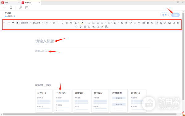 3、进入超星学习通的笔记创作界面后,我们可以依次写入笔记主题、正文;除此之外,我们还可以直接套用模板,或是利用工具,丰富自己的笔记形式。