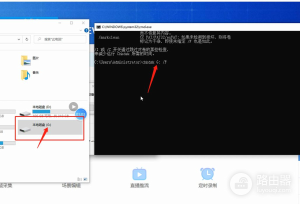 第三步:根据需要,输入命令检查磁盘并修复磁盘上从错误,如要修复G盘上从错误,则输入chkdsk G: /F( /F是一个用于修复磁盘上错误的参数,也可以根据需要和别的参数一起使用),然后 回车 ,它就开始检查了,检查好之后,若是存在坏的扇区,它就会自动修复,一会之后,它就检查并修复好了。