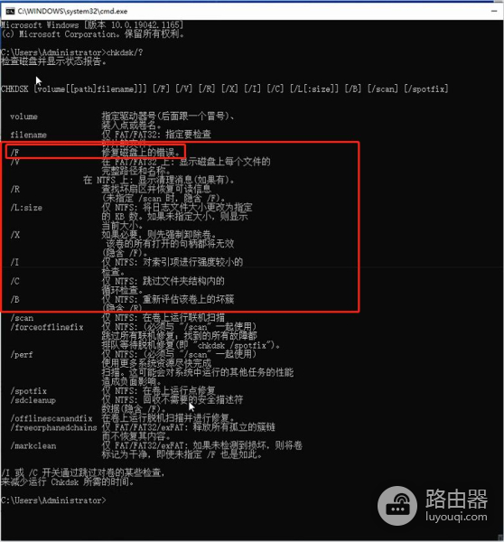 第二步:在打开的命令行输入 chkdsk/? 回车来查看一下帮助的信息