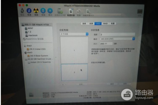 直接点击上方的磁盘工具,先对磁盘进行分区,我是准备winDOS系统2个分区,于是我把整盘分为2个分区,如图。