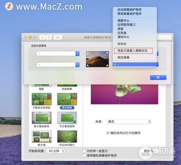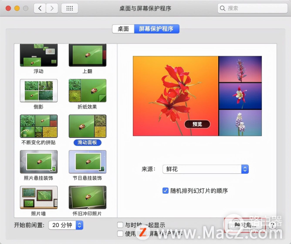 3、在桌面与屏幕保护设置界面,点击“屏幕保护”,然后点击右下角的“触发角”。