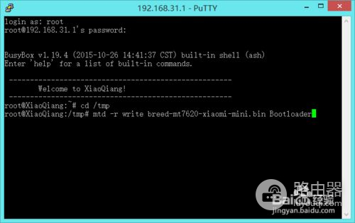如果出现下图,则表示登录成功,然后输入代码:mtd write /tmp/breed-youku.bin mtd1,完成后就说明成功刷入了breed,路由宝变得强大了