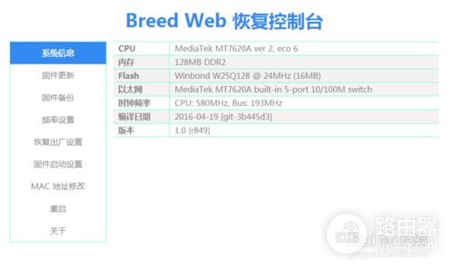 进入breed方法:路由断电后一直按住reset键,后插电,led灯全闪完成后,松开reset键,输入网址192.168.1.1进入Breed管理界面(注意登录网址与原路由宝网址不同)
