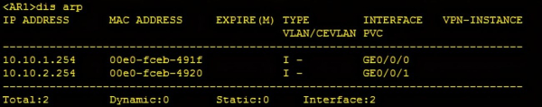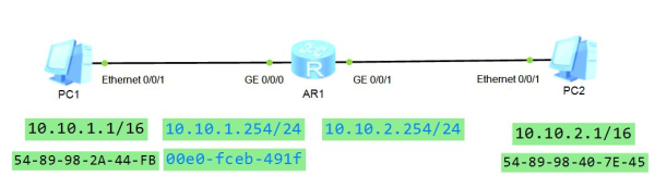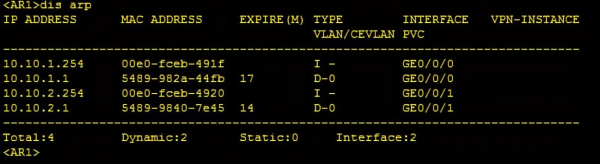 由上图知悉,路由器AR1的接口g0/0/0与PC1相连的IP地址10.10.1.254和PC2的IP地址10.10.2.1对应的MAC地址相同,都是AR1的00-E0-FC-EB-49-1F。