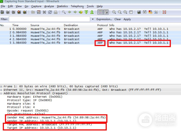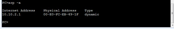 由上图知悉,PC2所拥有的IP地址10.10.2.1对应的MAC地址是00E0-FCEB-491F。