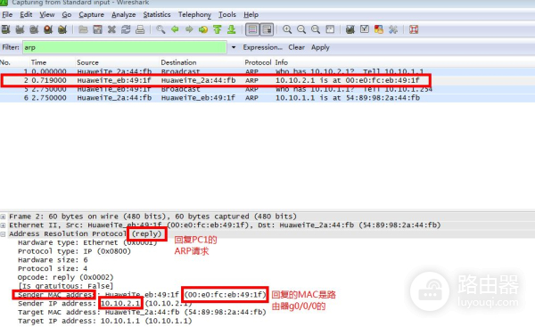 由上图抓包结果知悉,回复PC1的IP是10.10.2.1,但是MAC地址是路由器与PC1的接口g0/0/0的MAC地址(代理了PC2的MAC地址)。