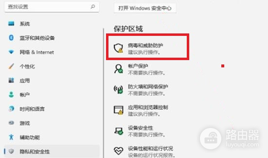 4. 打开后,点击保护区域下的“病毒和威胁防护”。如图所示:
