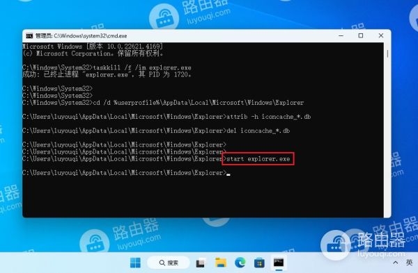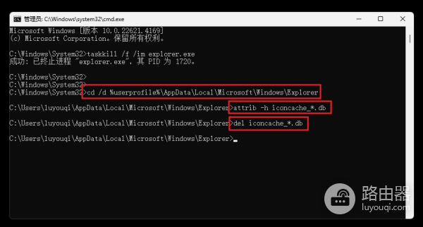4、在命令提示符中依次执行以下命令,清理图标缓存: