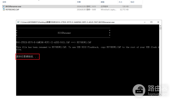 4、下载到BIOS文件之后,我们需要把文件解压,运行目录下的 BIOSRenamer.exe 程序对现有的BIOS文件改名,根据提示按任意键执行改名,然后将改名后得到的文件复制到U盘中。