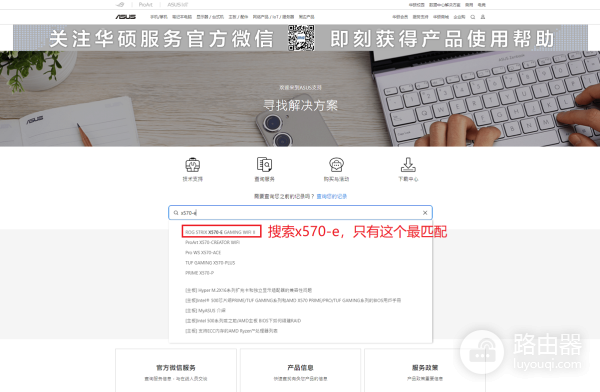 2、在官网下 http://www.asus.com.cn/support/载BIOS的时候,搜索 X570-E 只显示了 ROG STRIX X570-E GAMING wifi II 这个型号,以为就是它了。于是就选择了 ROG STRIX X570-E GAMING wifi II。