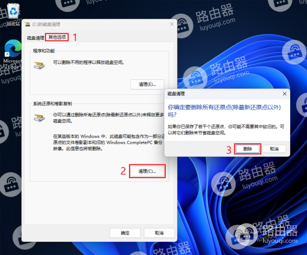或者在“其它选项”选项卡下,点击“系统还原和卷影复制”区域中的“清理”,然后点击“删除”清理系统还原点。