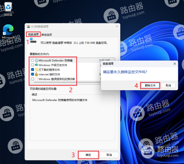 5、可以在“磁盘清理”选项卡下,勾选要清理的文件,点击“确定”,然后点击“删除文件”清理系统垃圾文件。