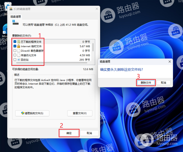 3、在要删除的文件下面,勾选要清理的文件,点击“确定”,然后点击“删除文件”清理垃圾文件。