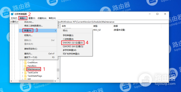 3、点击选择“Maintenance”,然后点击“编辑 -> 新建 -> DWORD(32位)值”。