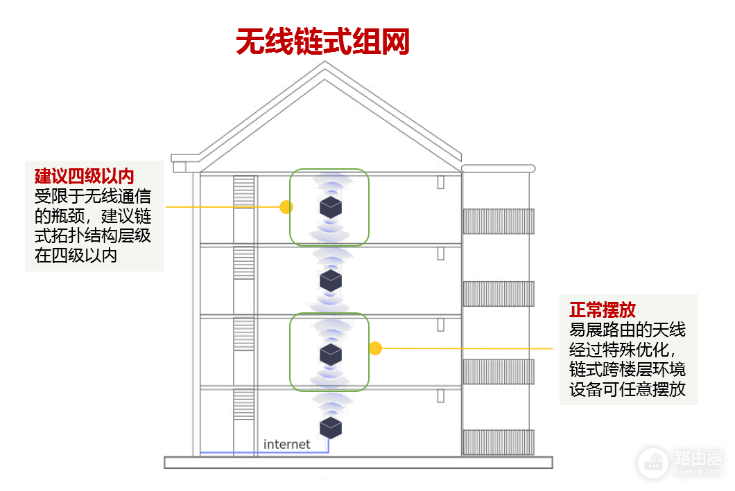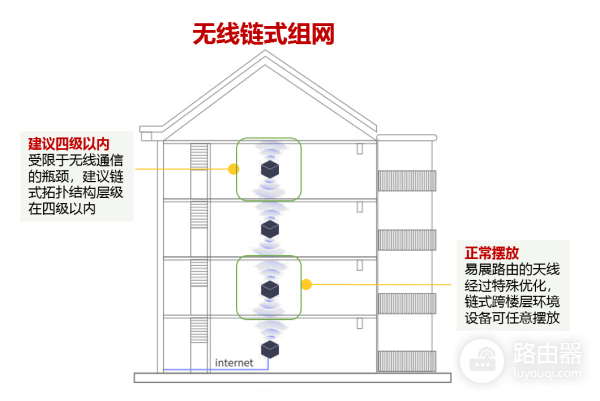 针对复式、别墅和公寓等环境,易展路由支持无线链式拓扑结构,最大程度的延时无线网络,确保终端的远距离通信。