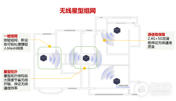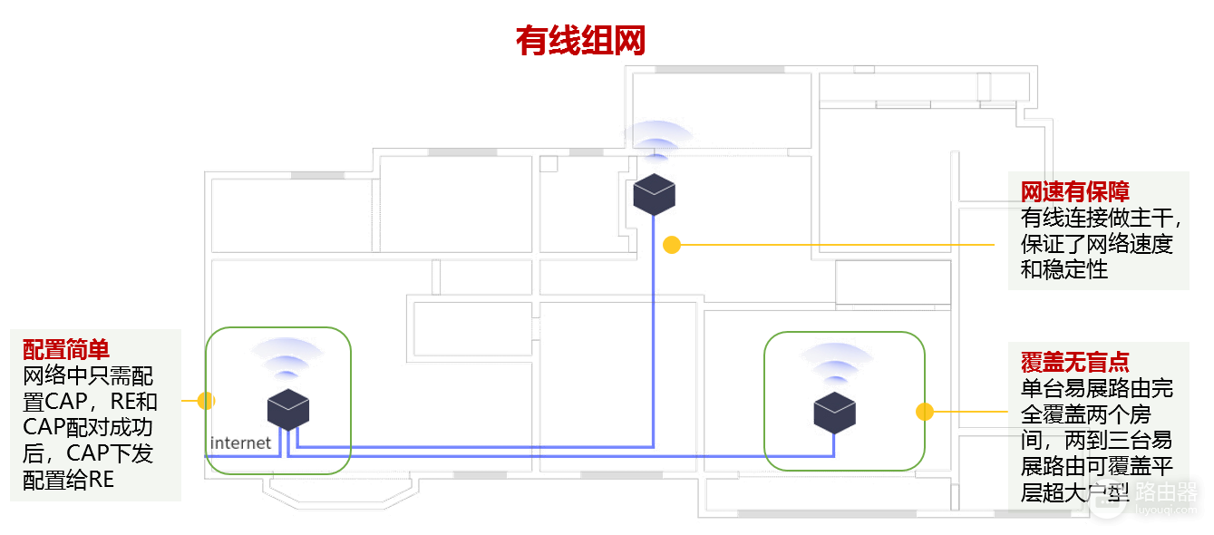 针对大平层环境,易展路由支持无线星型拓扑结构,最大程度的延时无线网络,确保终端的远距离通信。
