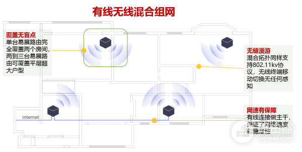 实际环境中存在布线,但是布线点位较少的情况,易展系列产品支持有线无线混合拓扑实现Mesh组网,同样满足无线终端在Mesh网络中无缝漫游。