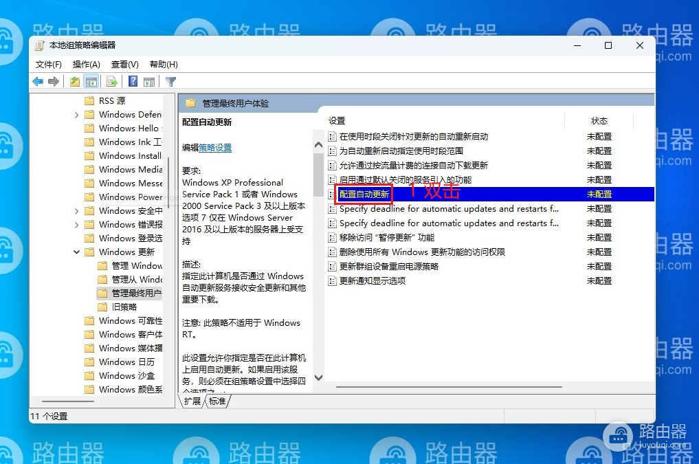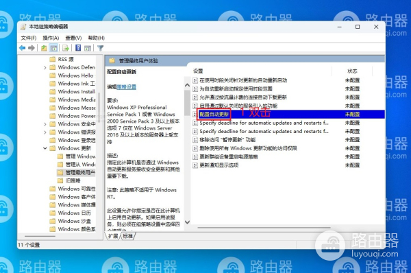 9、在本地组策略编辑器在左侧区域,依次展开“计算机配置 -> 管理模块 -> Windows组件 -> Windows更新 -> 管理用户最终体验”路径。