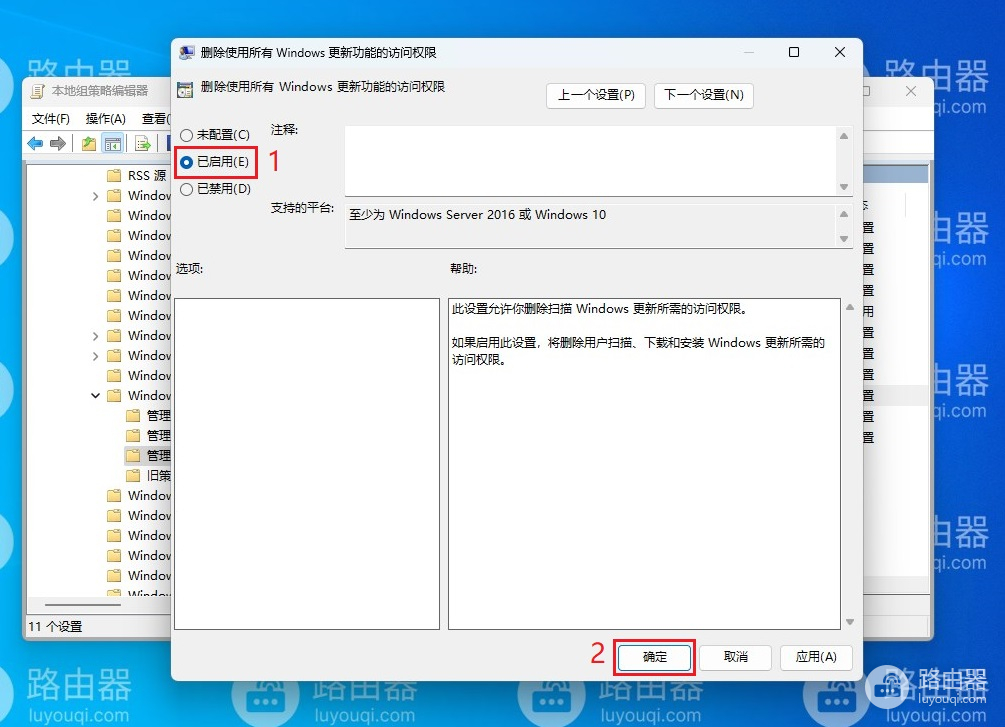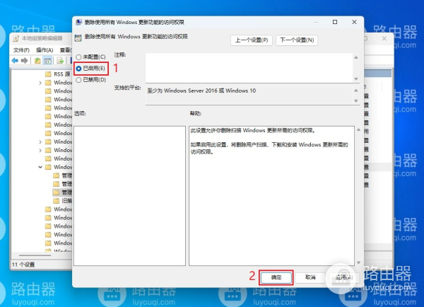 11、在右侧区域找到并双击“删除使用所有 Windows更新功能的访问权限”,在打开的窗口中选择“已启用”,并点击“确定”。