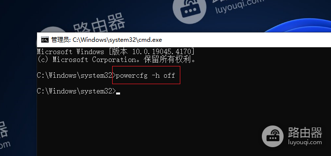 1、按快捷组合键“win+r”,输入“cmd”,再按“Ctrl+Shift+Enter”以管理员身份打开命令提示符,在命令提示符中输入“powercfg -h off”关闭系统休眠文件。