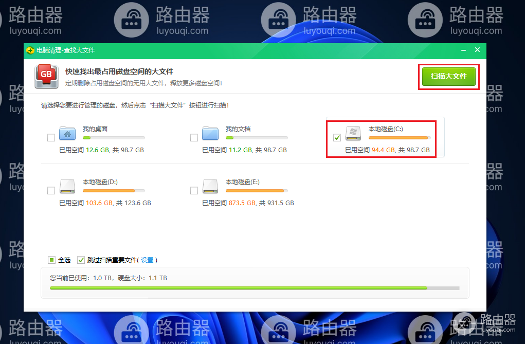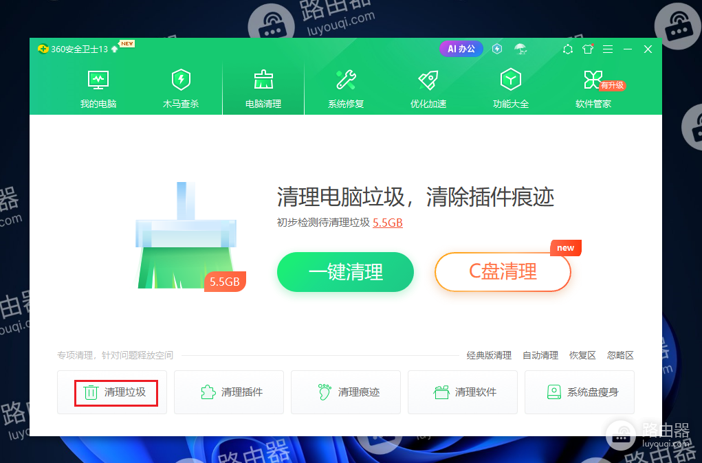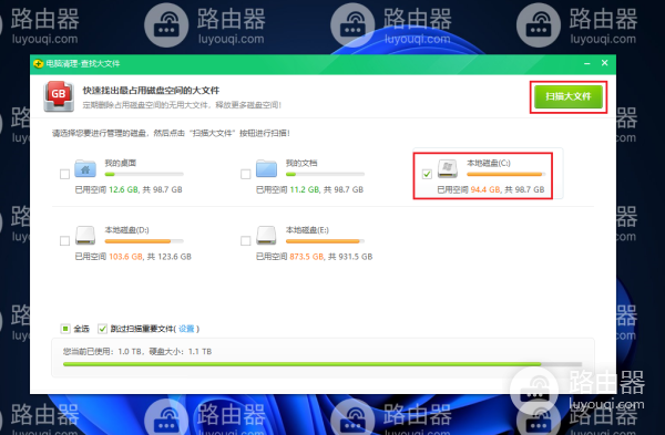 1、使用某安全卫士或某管家的清理垃圾功能清理C盘垃圾,还可以使用某安全卫士的查找大文件功能查找出C盘中的大文件然后手动删除或转移大文件到其它分区。