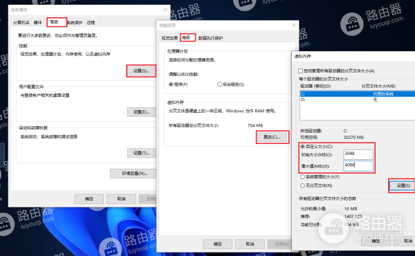 2、按快捷组合键“win+r”,输入“sysdm.cpl”,点击确定打开“系统属性”。在“系统属性”窗口点击“高级”选项卡的“性能”区域中的“设置”。在“性能选项”窗口点击“高级”选项卡“虚拟内存”区域中的“更改”调整虚拟内存大小或设置到其它磁盘分区。