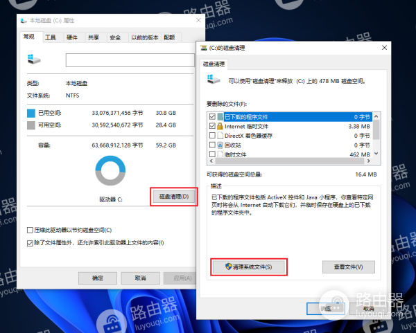 2、右键C盘 -> 选择“属性”-> 选择“常规”选项卡下的“磁盘清理”。