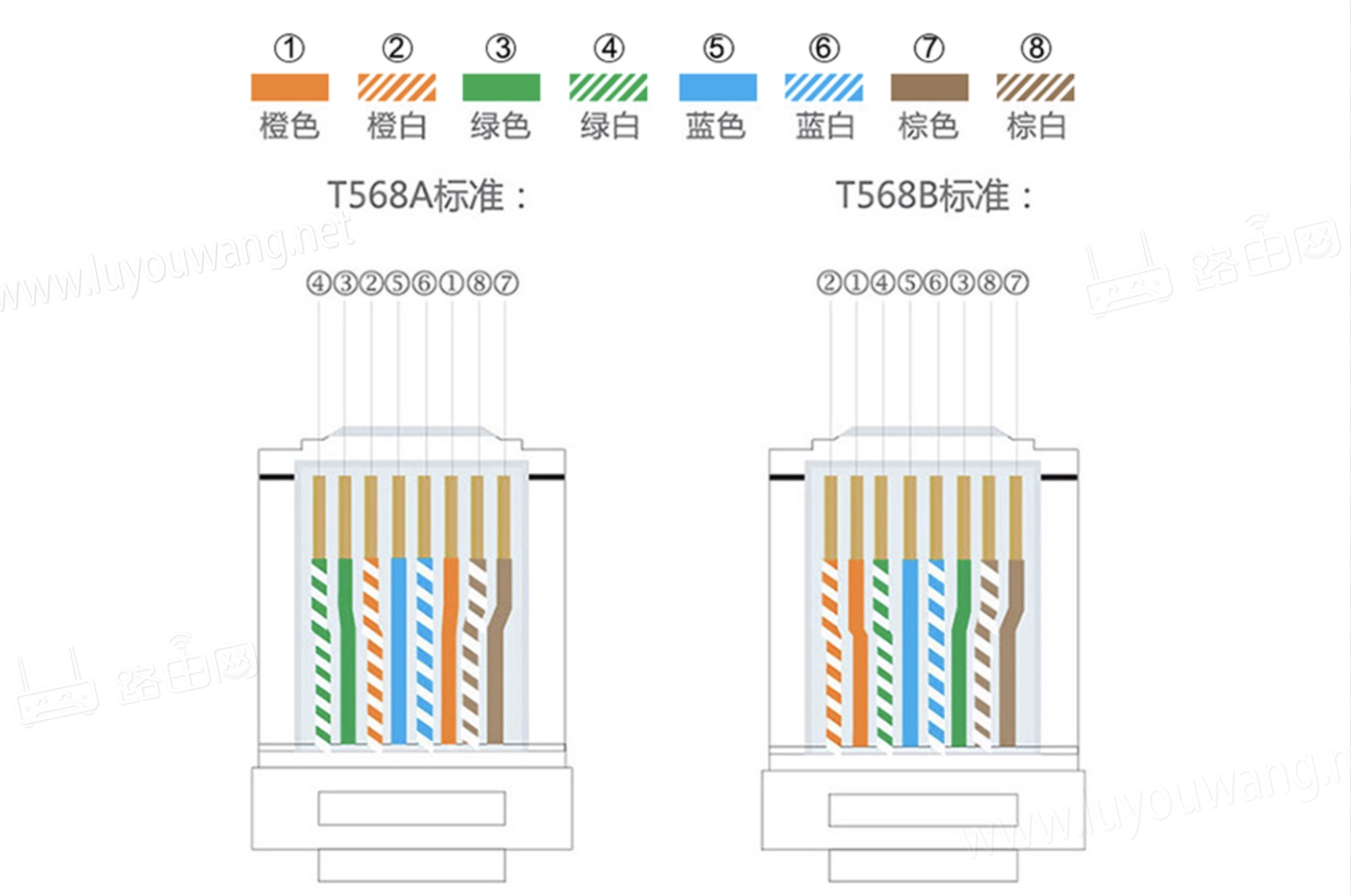不管是五类、六类网线的颜色都是一样的,它们都是有8条铜线组成,接法顺序有两种,T568B跟T568A顺序,比较常用的是T568B顺序接法。