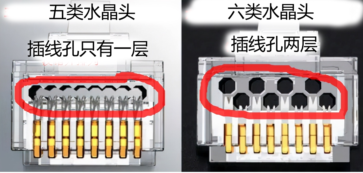 六类水晶头和五类水晶头,最大的区别就是,六类插网线线芯的插孔,是上下两排的,五类只有一排。
