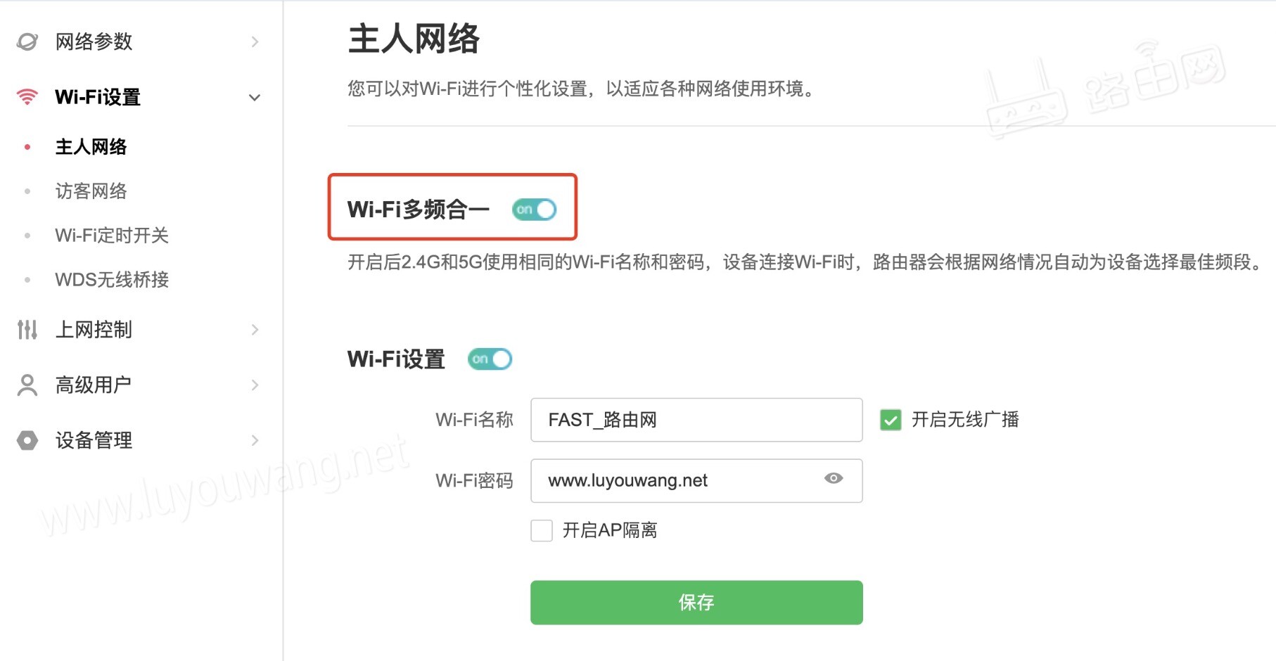 解决办法:路由器关闭多频合一功能的方法如下:登录路由器管理界面 >> 常用设置 >> 无线设置>> 关闭多频(双频)合一,如下图: