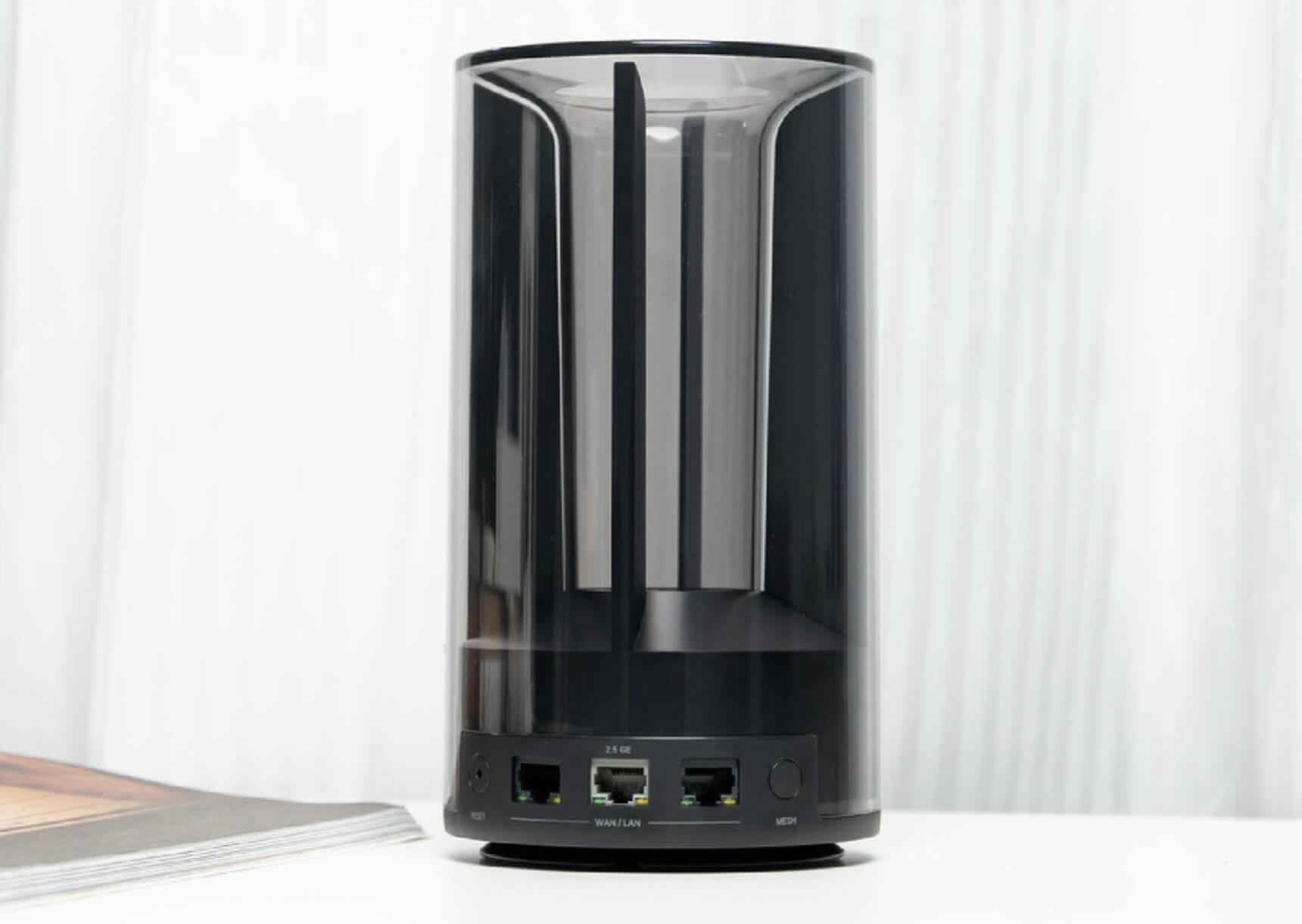 它将竖直的四根天线和核心组件精心设计了一遍,最终实现了小巧的体积,竖向的放置也让它占地面积极小。并且它还在此之上套了一个黑色的透明外壳,哪怕不接电使用,看起来也会有一种独特的精致感。