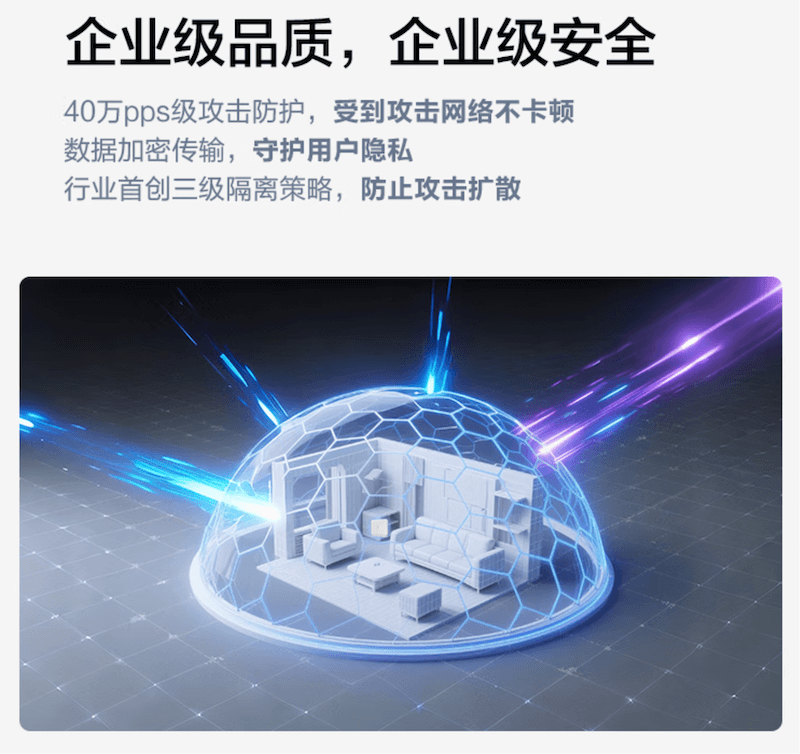 其他方面,这款路由器提供双 2.5GE + 双 GE 网口,支持路由、桥接双模式,支持无线 Mesh,上电秒通网,支持 40 万 pps 级攻击保护,行业首创三级隔离策略,防止攻击扩散。