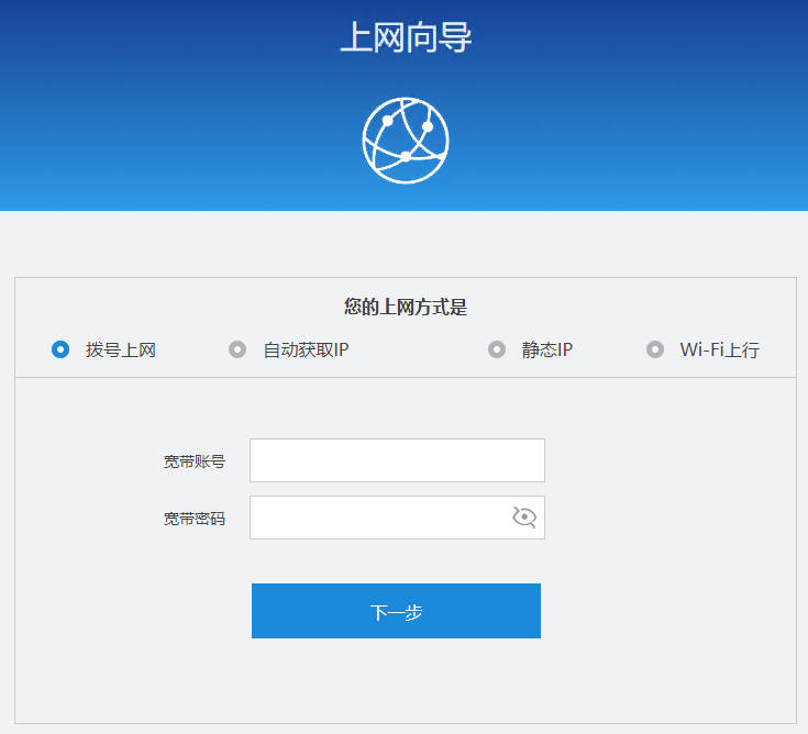 检测到上网方式为拨号上网:输入宽带账号和密码,点击“下一步”。
