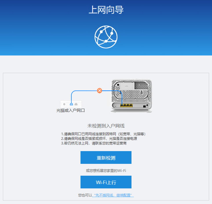 点击“先不插网线,继续配置”: 手动选择上网方式,拨号上网或自动获取IP跳转到步骤3。