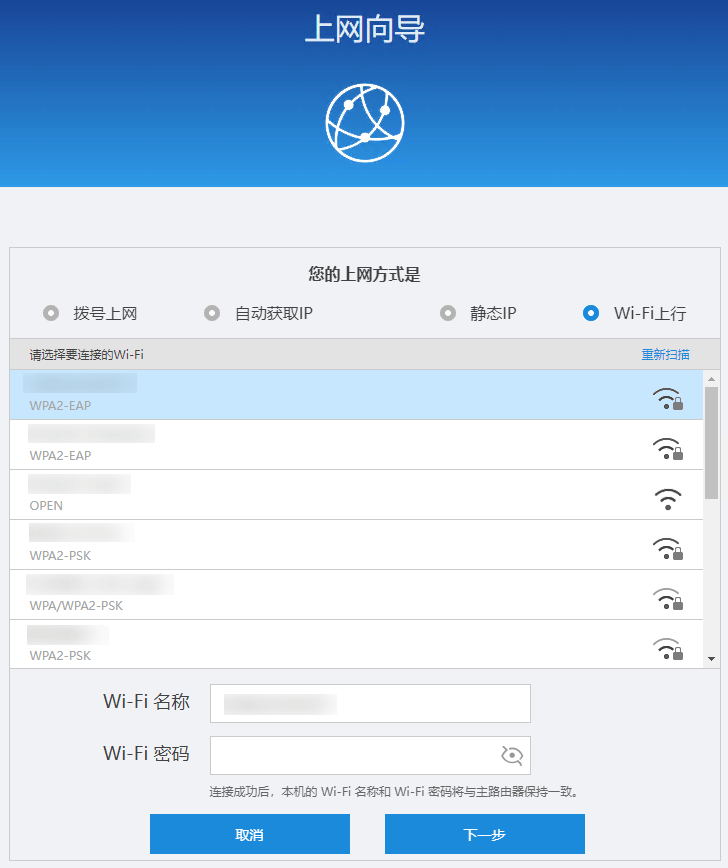 点击“Wi-Fi上行”: 配置设备上网模式为Wi-Fi上行模式,跳转到步骤4。