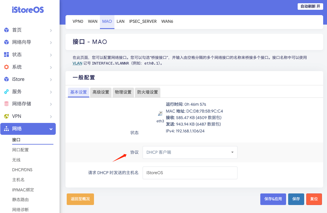 网络→接口,新建一个接口名称随意,协议选择:DHCP客户端
