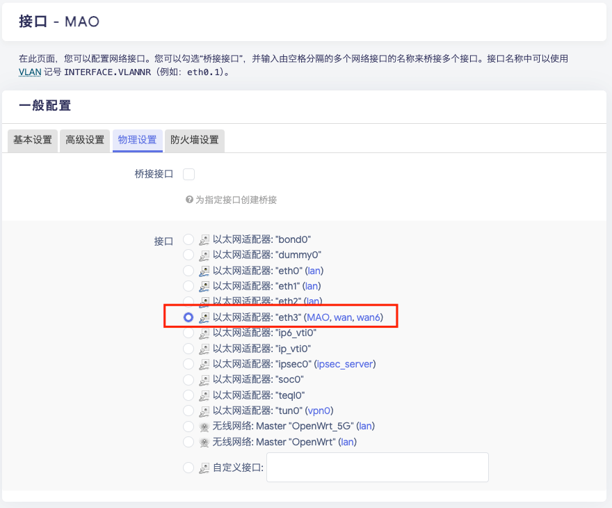 物理设置里选择WAN的这个网口,保存应用即可。