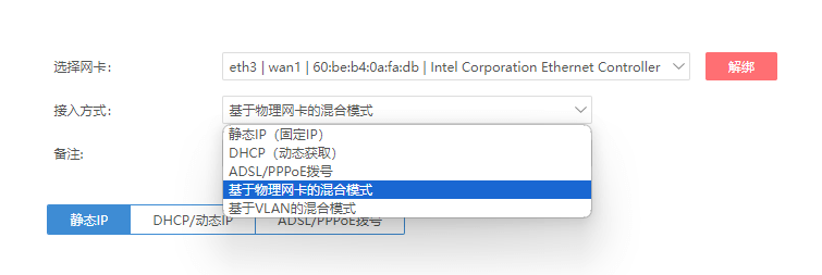 爱快系统的路由器实现单线复用的方式,是基于物理网卡的混合模式,设置也很简单: