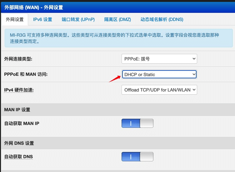 设置静态IP,例如光猫后台是192.168.1.1,可以设置IP为192.168.1.100,网关设为光猫的地址192.168.1,这里也可以使用DHCP。