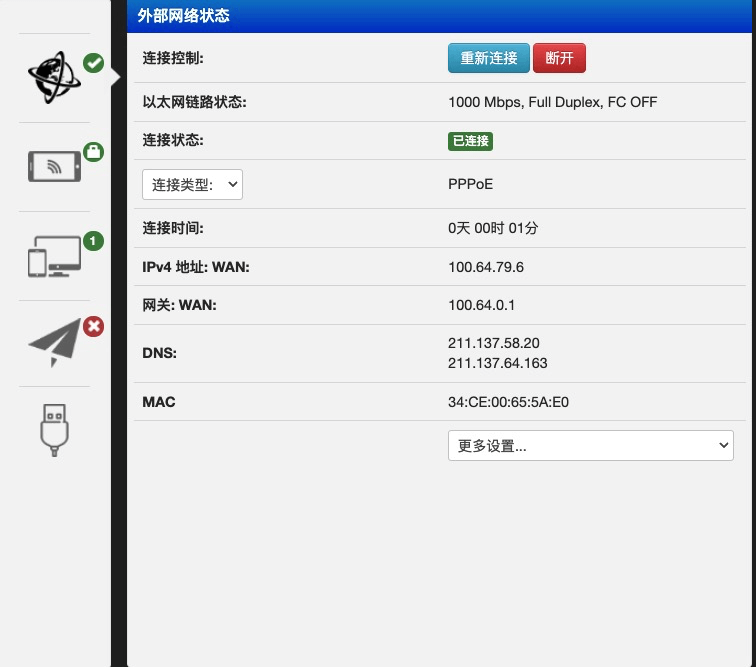 首先这是默认拨号后外部网络状态,可以看到获取的外网WAN的ip和网关、DNS等信息
