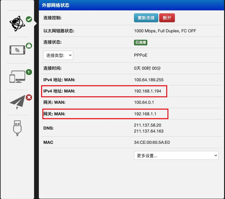 刚新建的MAO这个接口获取到了光猫下发的内网ip,现在可以访问光猫后台了。